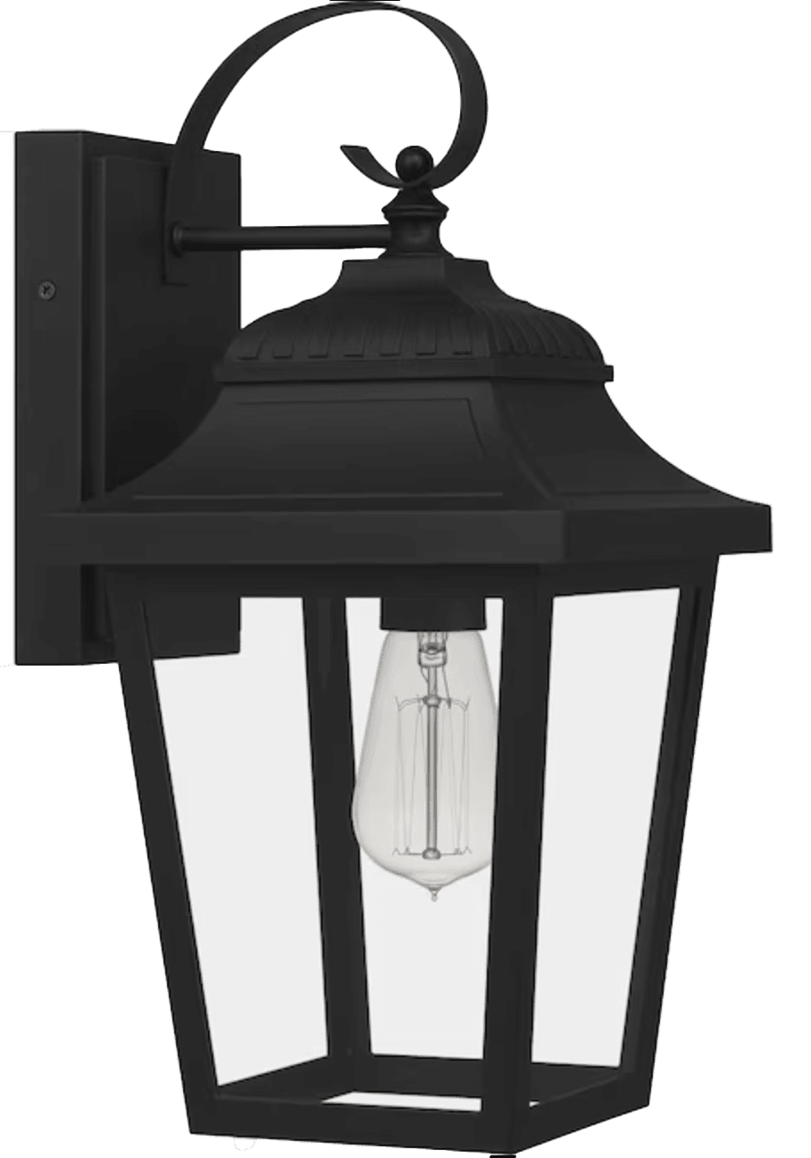 LIGHT FIXTURES Lantern-style light fixtures with an ornate top scroll flank the front door. Ashley Harbour Penny Outdoor Wall Light, Matte Black, $76, lowes.com