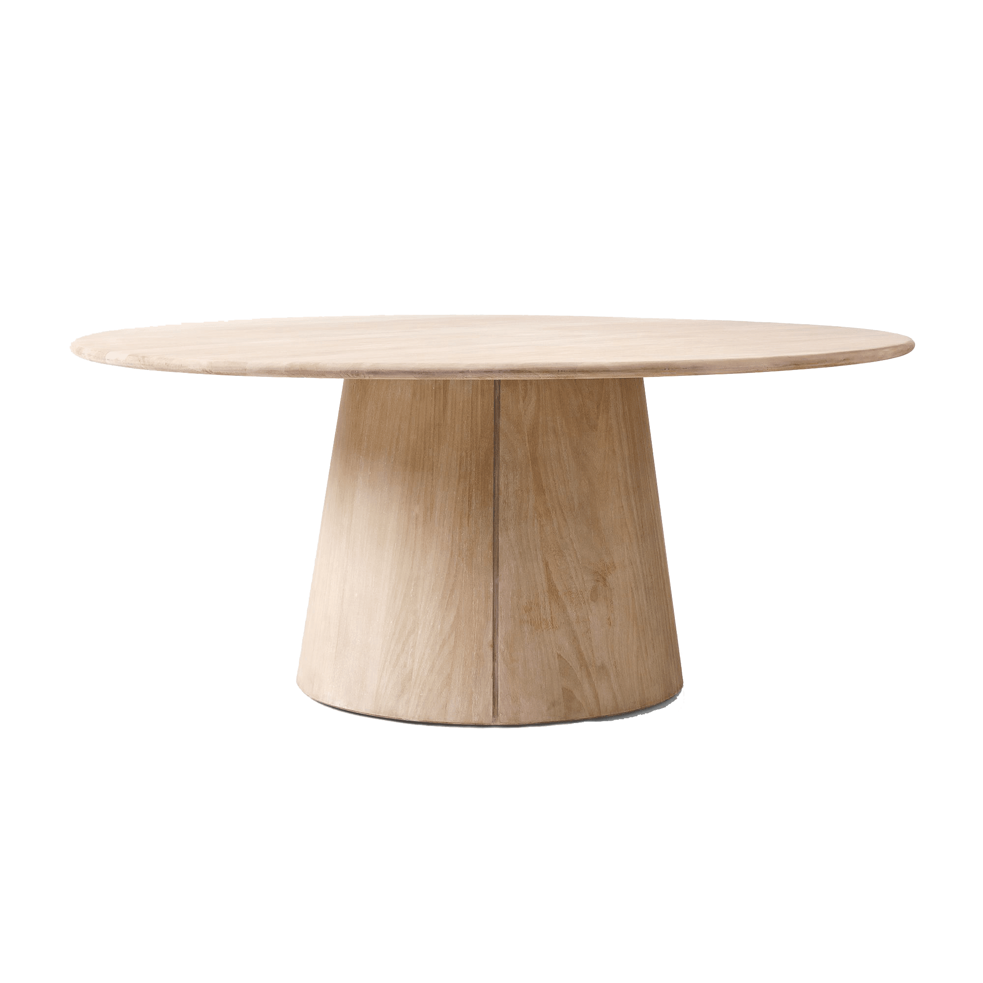 Merry-Go-Round The graceful curves of this table make it feel like a piece of art. Crafted from mango wood, the cerused white finish feels fresh and beachy. Anton Round Pedestal Dining Table, 72”, $1,700,