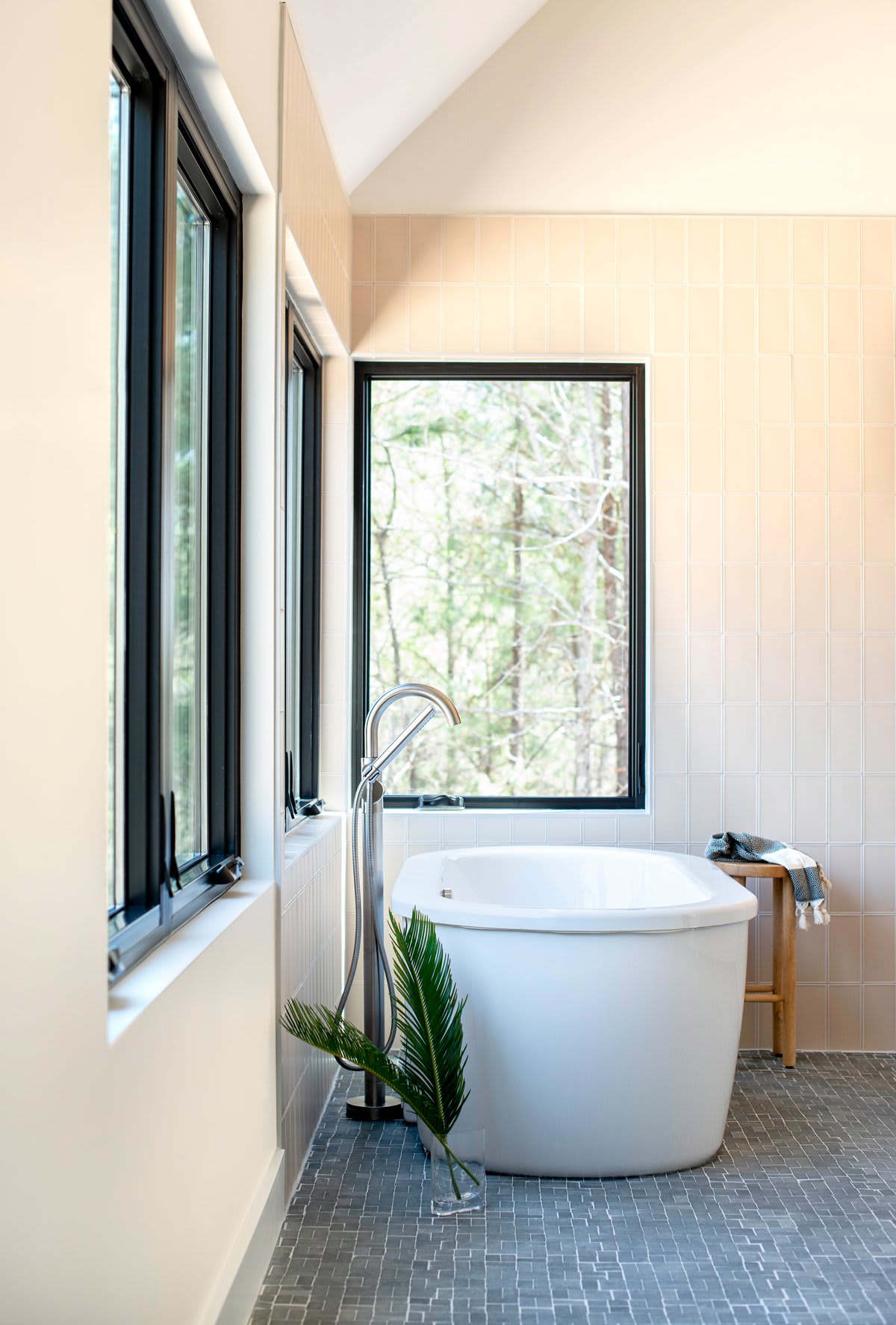 For the upstairs primary bathroom, a spa-like feel was the goal. Wanting to make the most of the view of the canopy of trees beyond, Dorinsky and Ashtiani chose a soaking tub set against blush-toned ceramic tiles that playfully bounce light around the room. The scones, sourced from Esty, were powder-coated in a similar pink hue, resulting in a dramatic tone-on-tone effect. Rounded mirrors echo the curves of the sconces.
