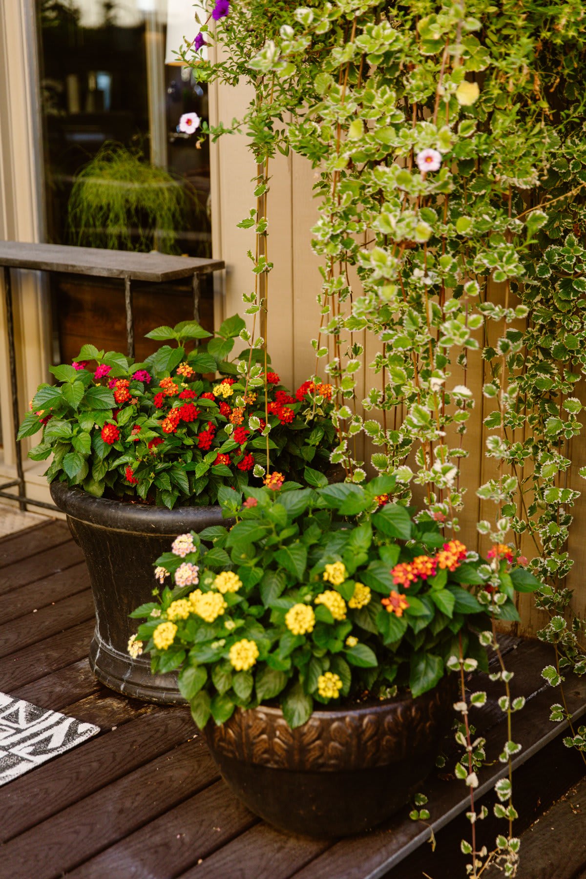 GREENERY As a former high-end event florist, Schell feels that greenery and florals play an important role in creating outdoor spaces. He is a fan of container gardens, using pots of varying sizes to house nearly all of their plants and trees. “I am able to move the trees and plants around seasonally, swapping them out as needed.” This also allows the placement of potted plants at various heights, keeping each plane of sight full of visual interest.