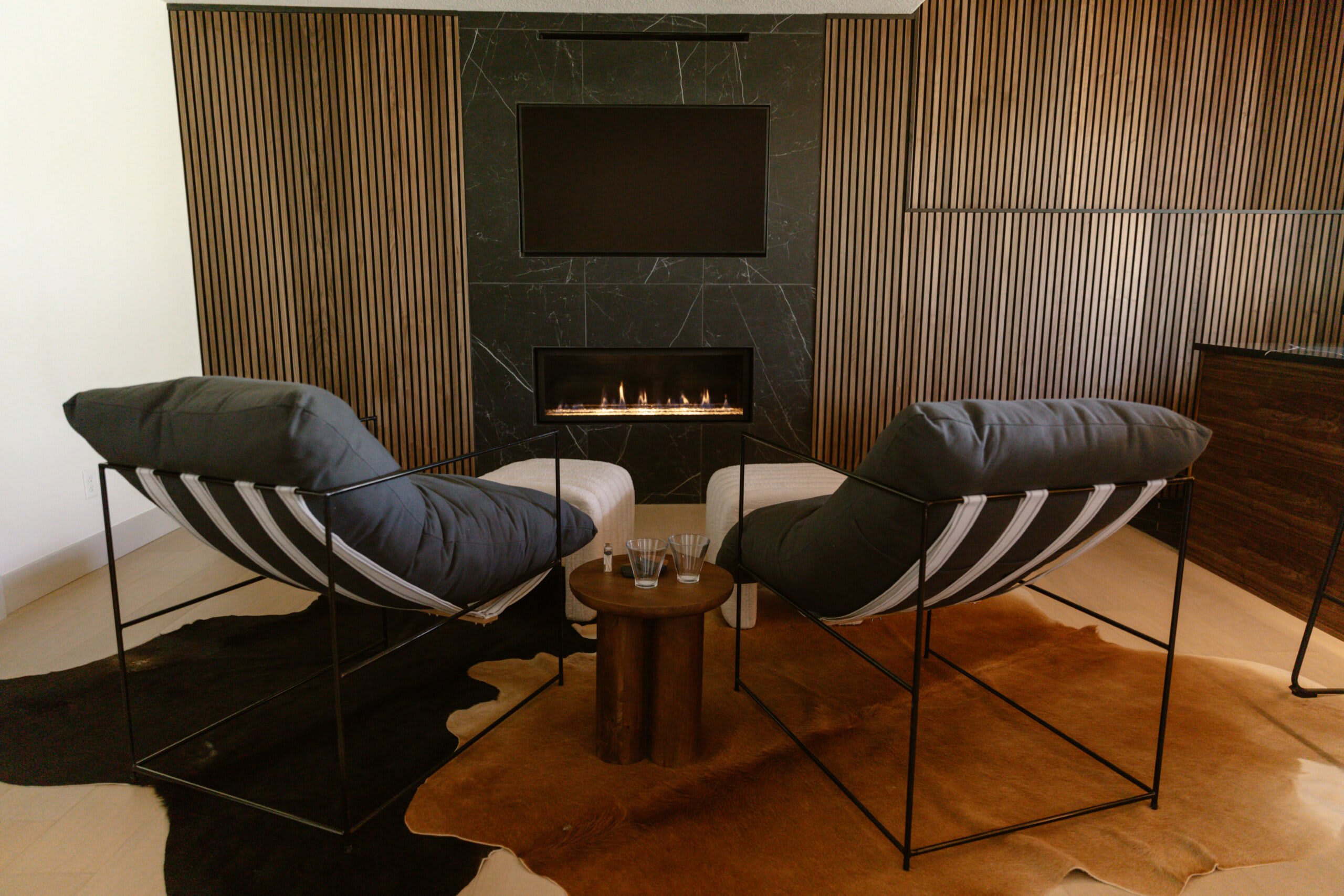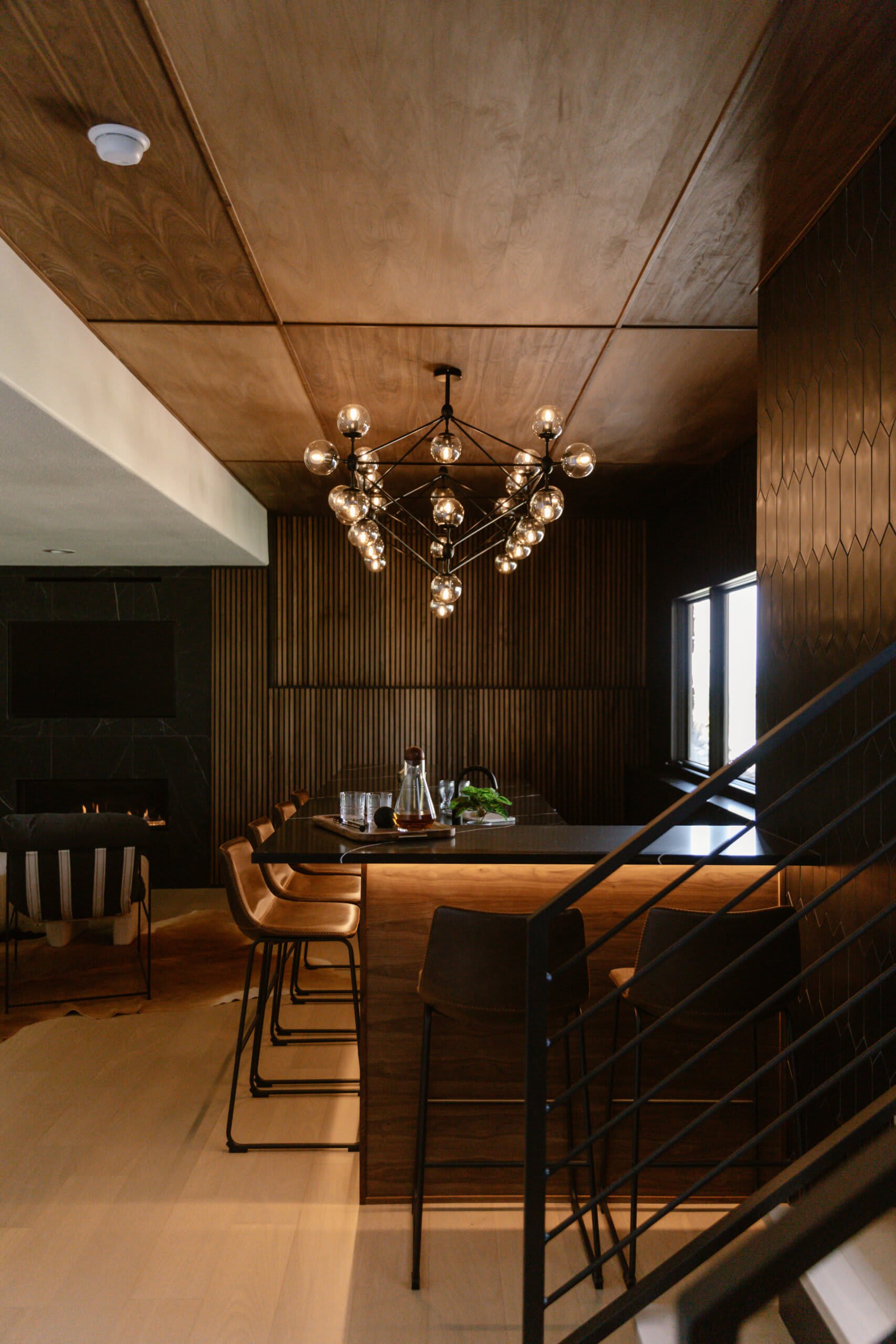 As you descend the iron staircase, you are wrapped in warm woods and soft lighting. Slat walls are again utilized to bring texture, depth, intrigue, and continuity to the home. Within the slats, a hidden door is camouflaged to the left of the fireplace, leading to a secret playroom for kids. On the ceiling, walnut wood panels were installed in a checkered pattern, alternating between lighter and darker. Medium-toned walnut panels clad the front of the bar, illuminated by the soft glow of under-mount lighting. White oak floors underfoot add one more species of natural wood to the palette.