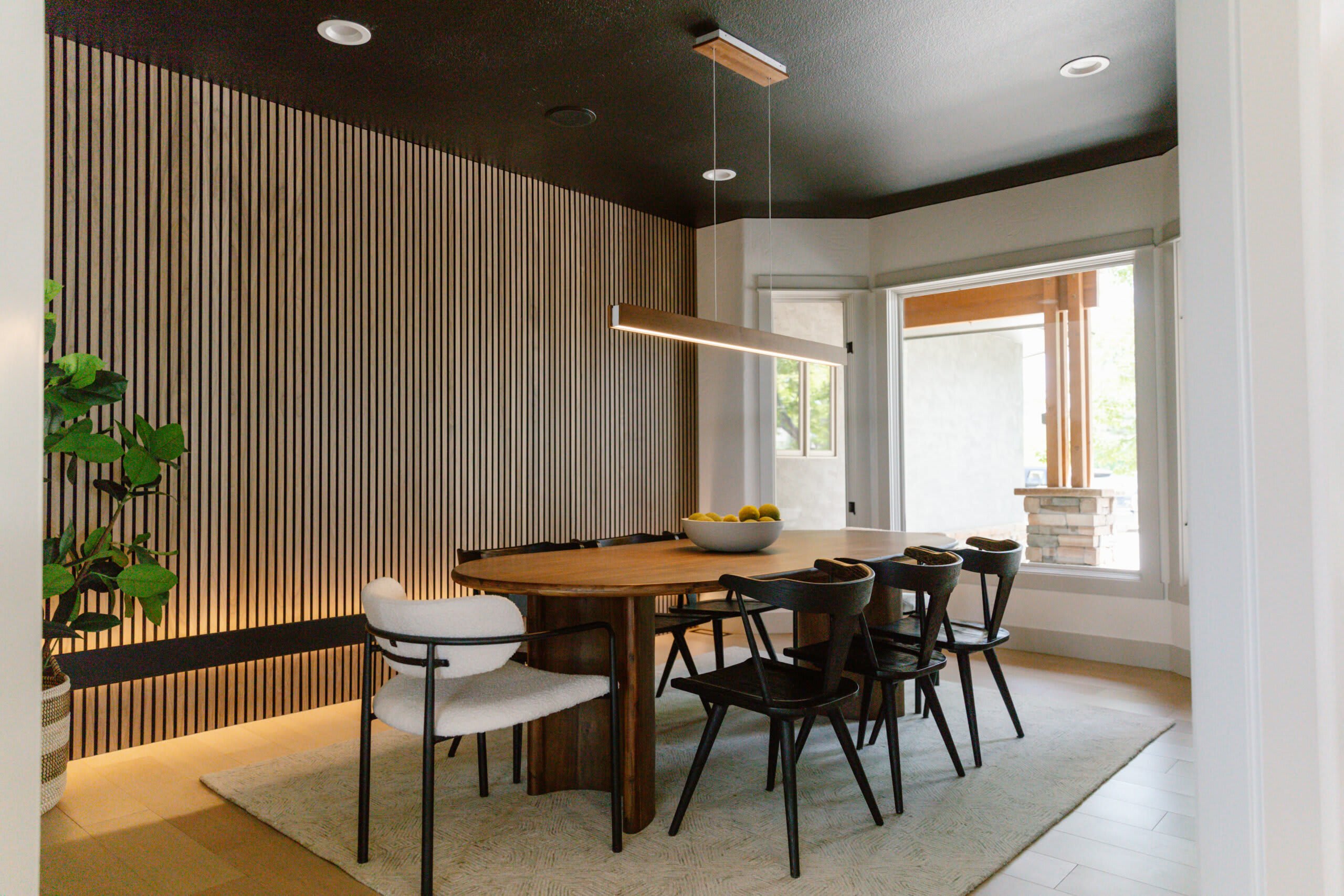In the adjacent dining room, the simple act of painting the ceiling a rich black (Iron Ore by Benjamin Moore), creates a cozy, cocoon-like feel. For the walnut wood slat wall, the wall behind was also painted black before installing, further enhancing the visual depth of the room. At the lower sixth of the wall, a horizontal black beam creates an exaggerated break in the slats and allows for a diffused lighting effect, glowing above and below the crossbeam.