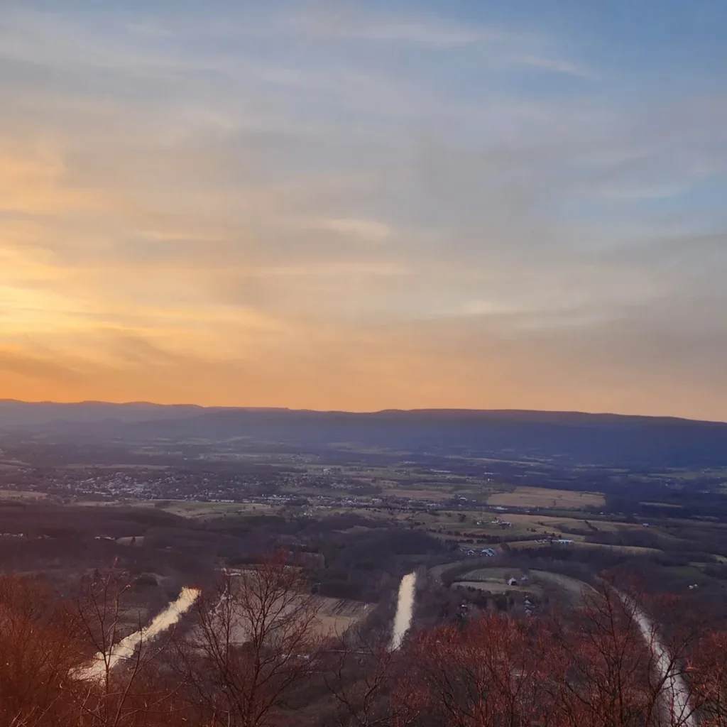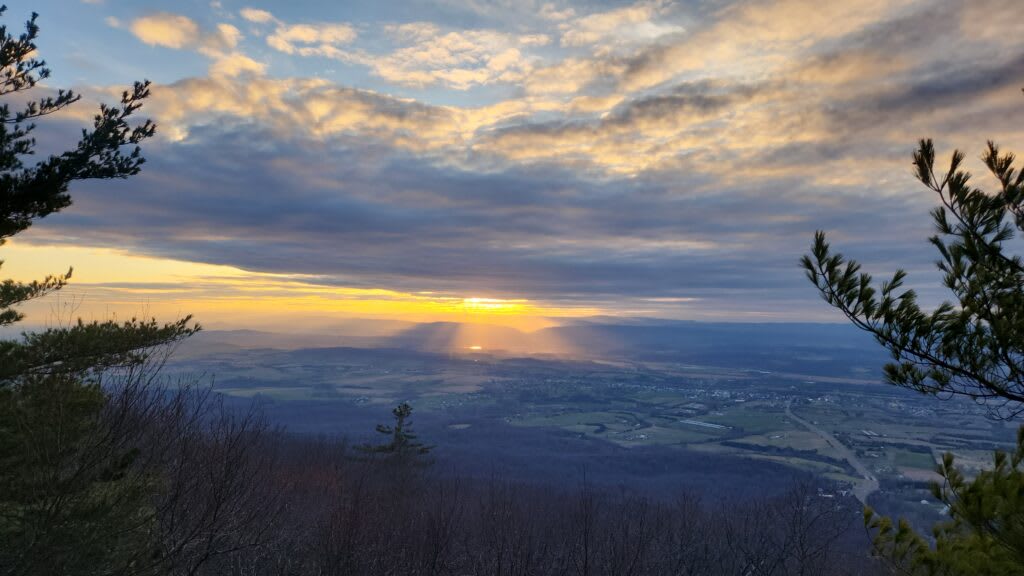 This hike overlooks New Market, VA. If you are heading from New Market to Luray on 211, the entrance to the hike is at the top. It is definitely a hike, and is pretty steep for most of the hike. It takes about an hour to an hour and 15 minutes to get to the top, and is an ideal spot to watch the sunset.