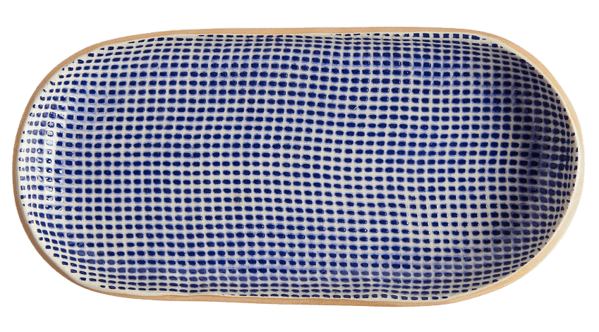 PLATTER The distinct pattern of this handcrafted ceramic stoneware is created by applying liquid porcelain to textiles and lace. Terrafirma 9” Canape, $79,